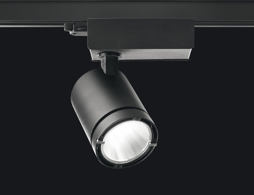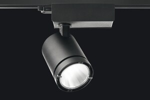LED-Strahler MD-Serie mit modularer DEN-Technologie für Stromschiene mit Dreh-/Kippgelenk und Wideflood-Reflektor (46°), Lichtkopf 355° drehbar 90° schwenkbar, inkl. Versorgungseinheit, Adapter für 3-Phasen-Stromschiene