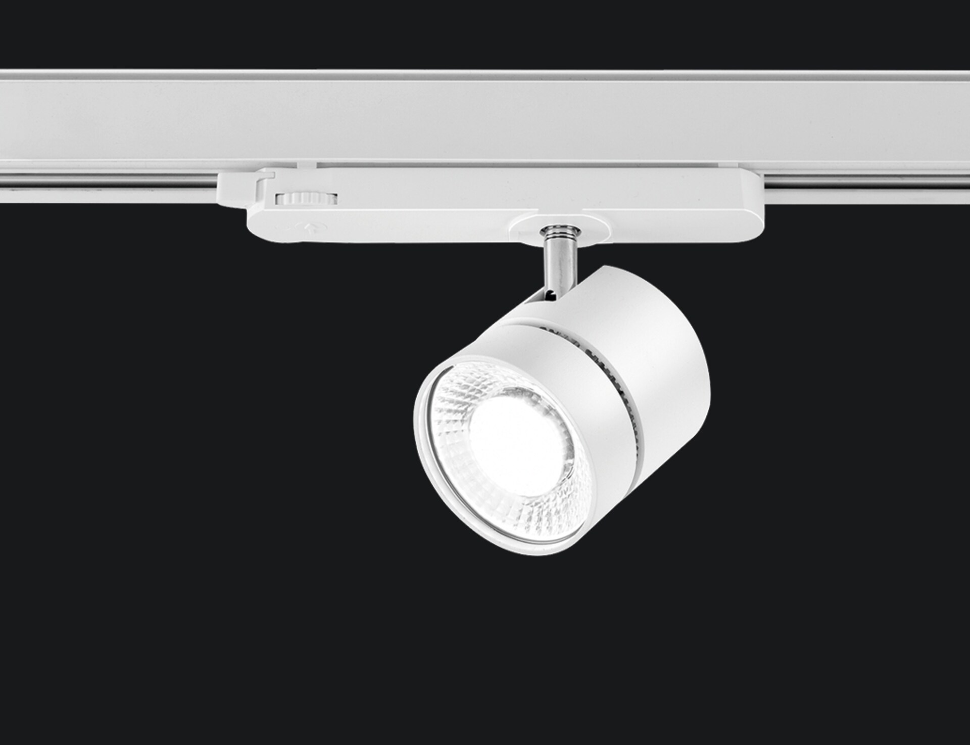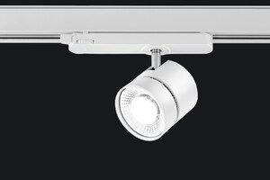 LED-Strahler TM-Spot Small mit modularer DEN-Technologie in kompaktem Gehäuse für Stromschiene mit Dreh-Kippgelenk mit Linsentechnologie (15°/36°/60°), Lichtkopf 355° drehbar und 180° schwenkbar, inkl. Versorgungseinheit mit einstellbarem Lichtstrom