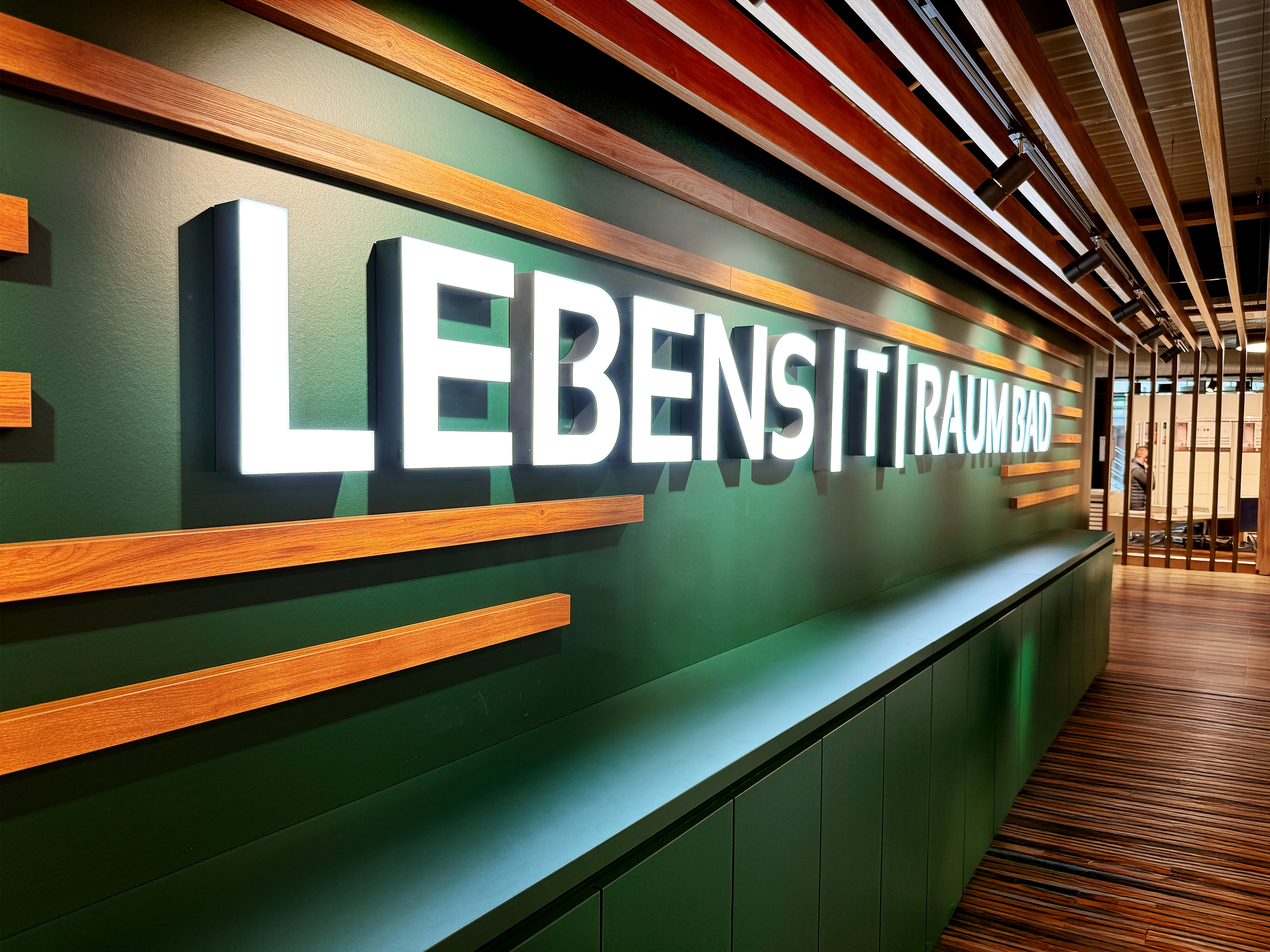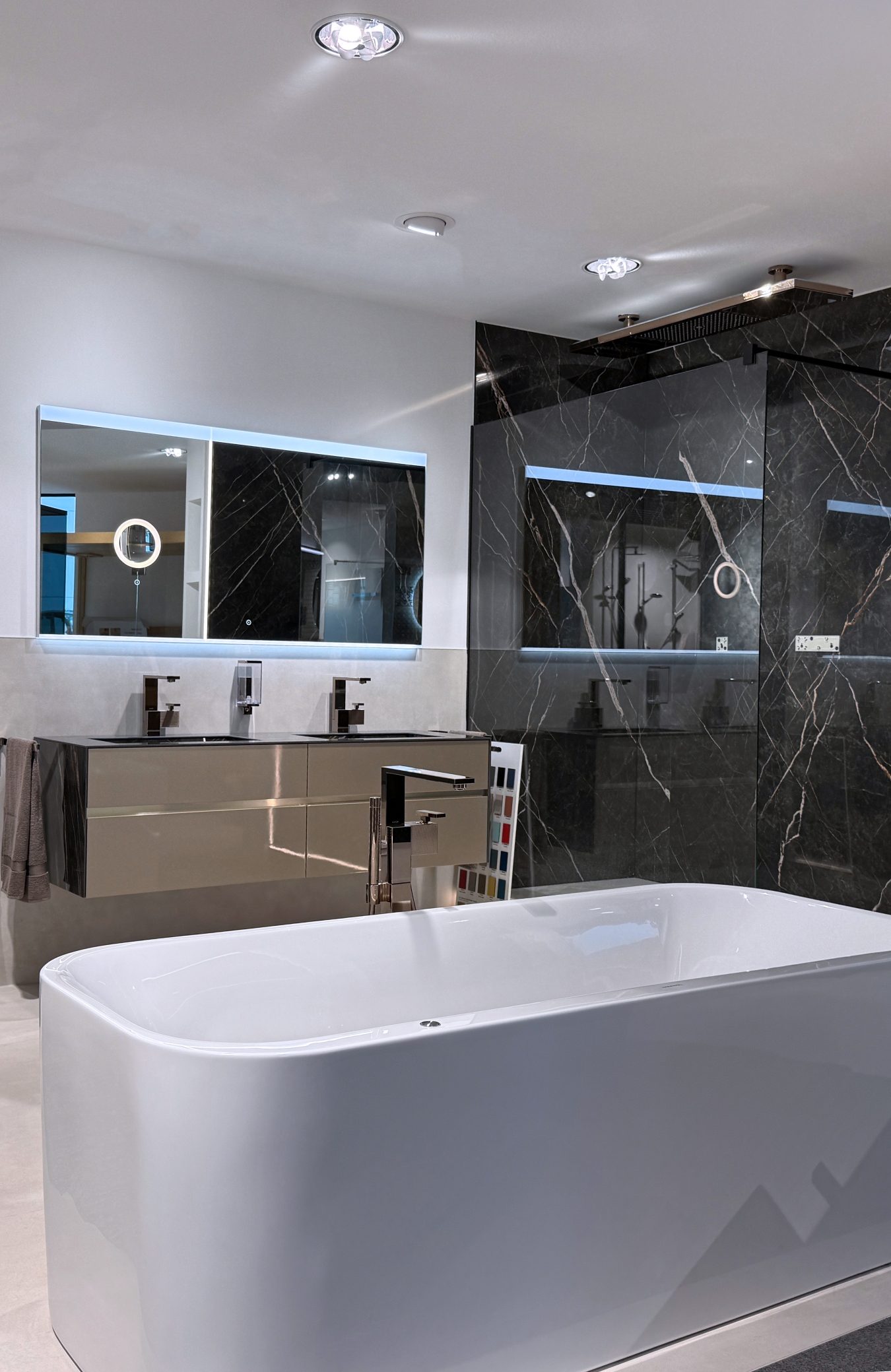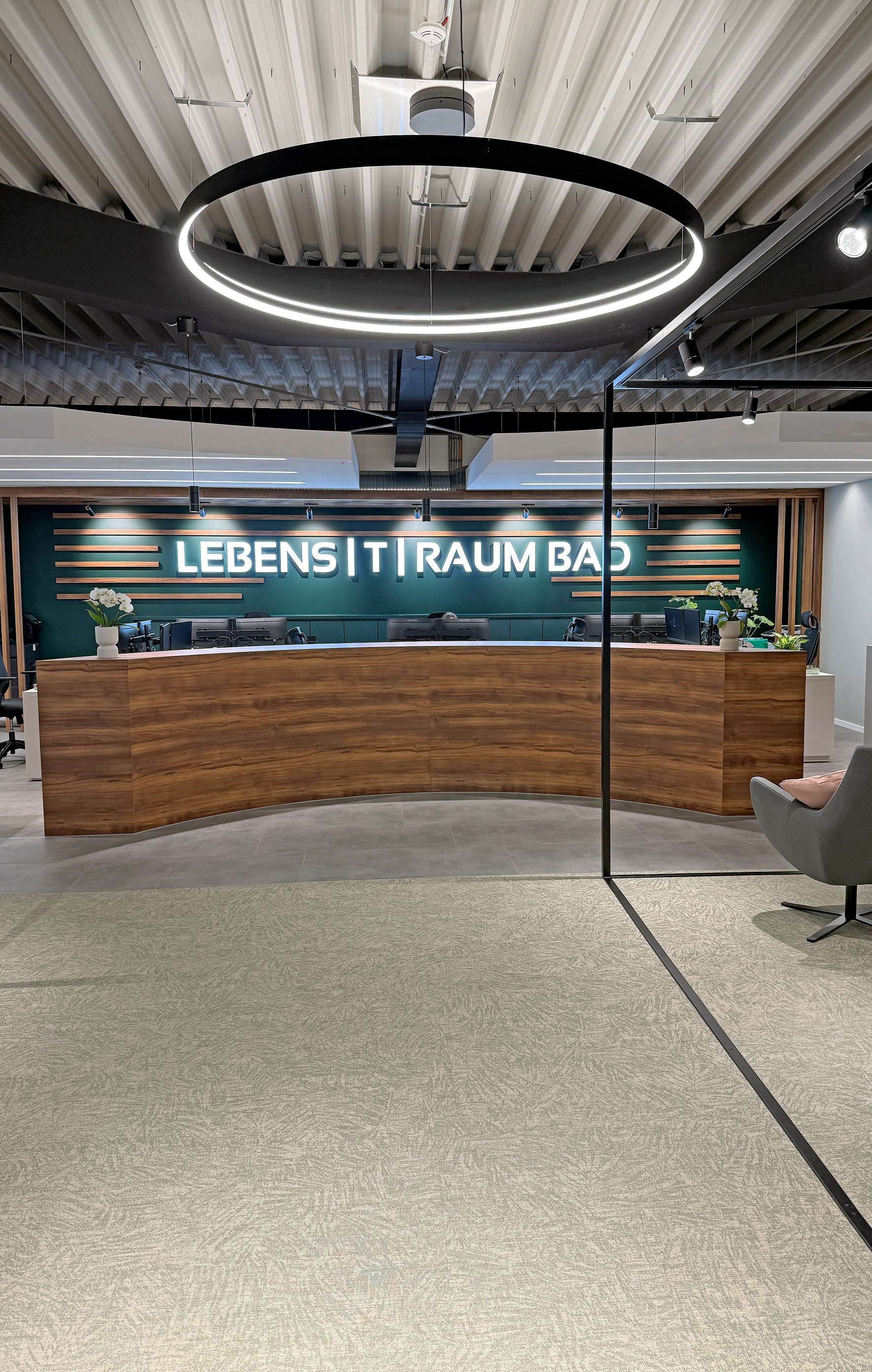 In Limburg realisierte die Eisen-Fischer GmbH & Co. KG auf 770 m² eine neue Ausstellung. LEBENS |T| RAUM Bad zeigt, wie wirkungsvoll Licht Räume inszenieren kann. Für Eisen Fischer durften wir eine Beleuchtung umsetzen, die Funktion und Atmosphäre in Einklang bringt. Zum Einsatz kamen die Strahler MDG und QGD an der Stromschiene, die die verschiedenen Badwelten gezielt und differenziert in Szene setzen. Im Arbeitsbereich sorgen Einbauprofile UE6E für eine angenehme, blendfreie und gleichzeitig arbeitsstättenrichtlinienkonforme Beleuchtung. Der komplette Bereich ist dabei individuell und flexibel regelbar. Ein besonderes Highlight im Mittelbereich ist die 2.500 mm große Ringleuchte RE-Type, die dem Raum eine starke, prägende Wirkung verleiht. Und auch das Erlebnis kommt nicht zu kurz: In einer Koje lässt sich die Lichtstimmung auf Knopfdruck von warmem Kerzenschein bis hin zu arktischem Sommer verändern. Die Steuerung erfolgt komfortabel über einen speziellen Taster oder per App auf Tablet und Smartphone. So bleibt der Gang zum Fenster erspart. Selbst an einem tristen Wintertag kann so auf Wunsch eine sonnige Lichtstimmung erzeugt werden.