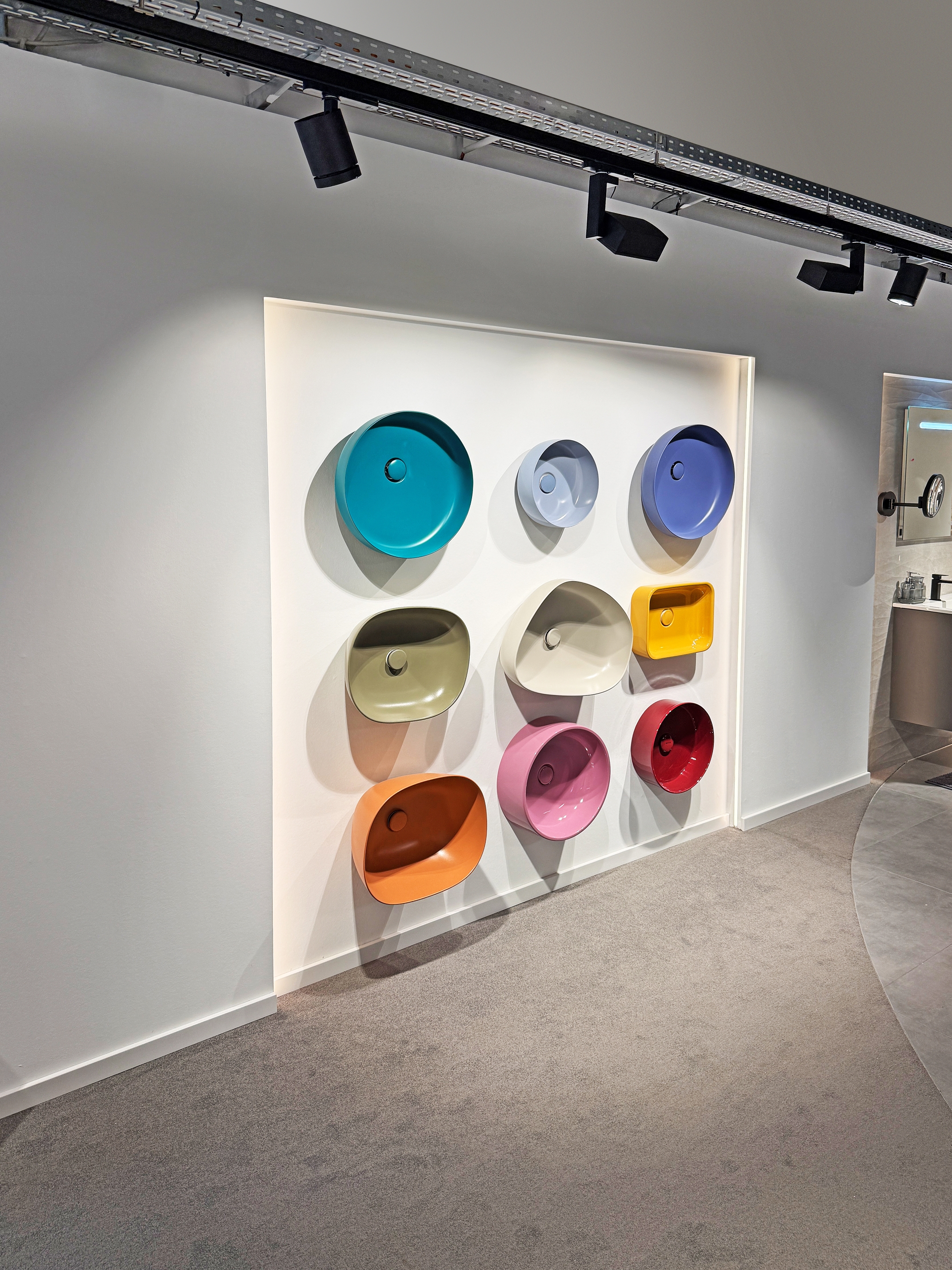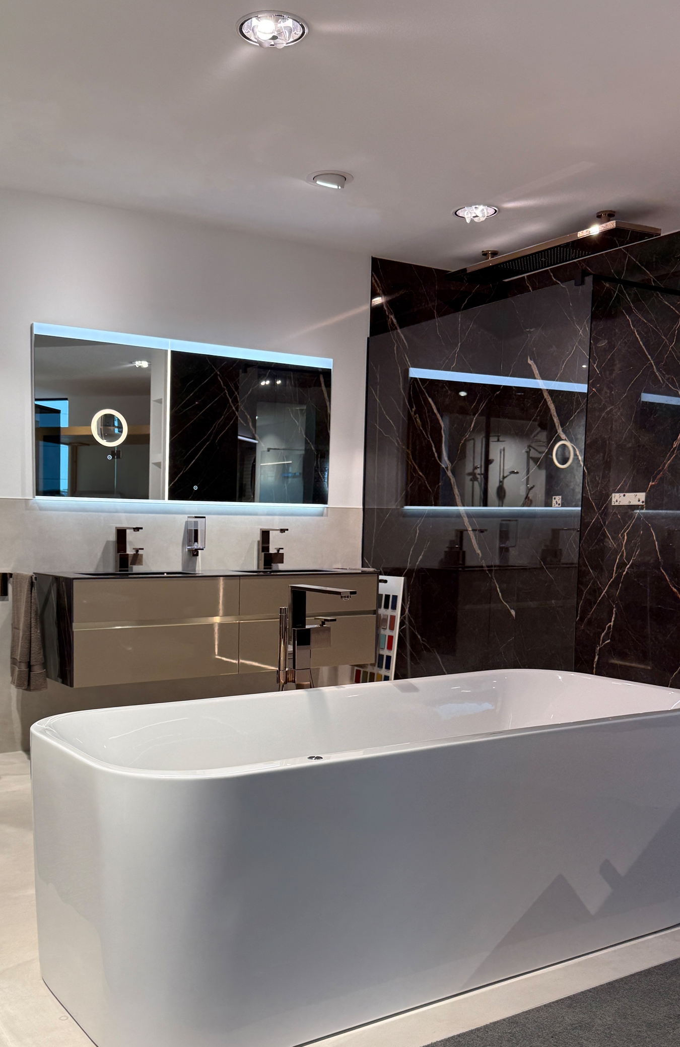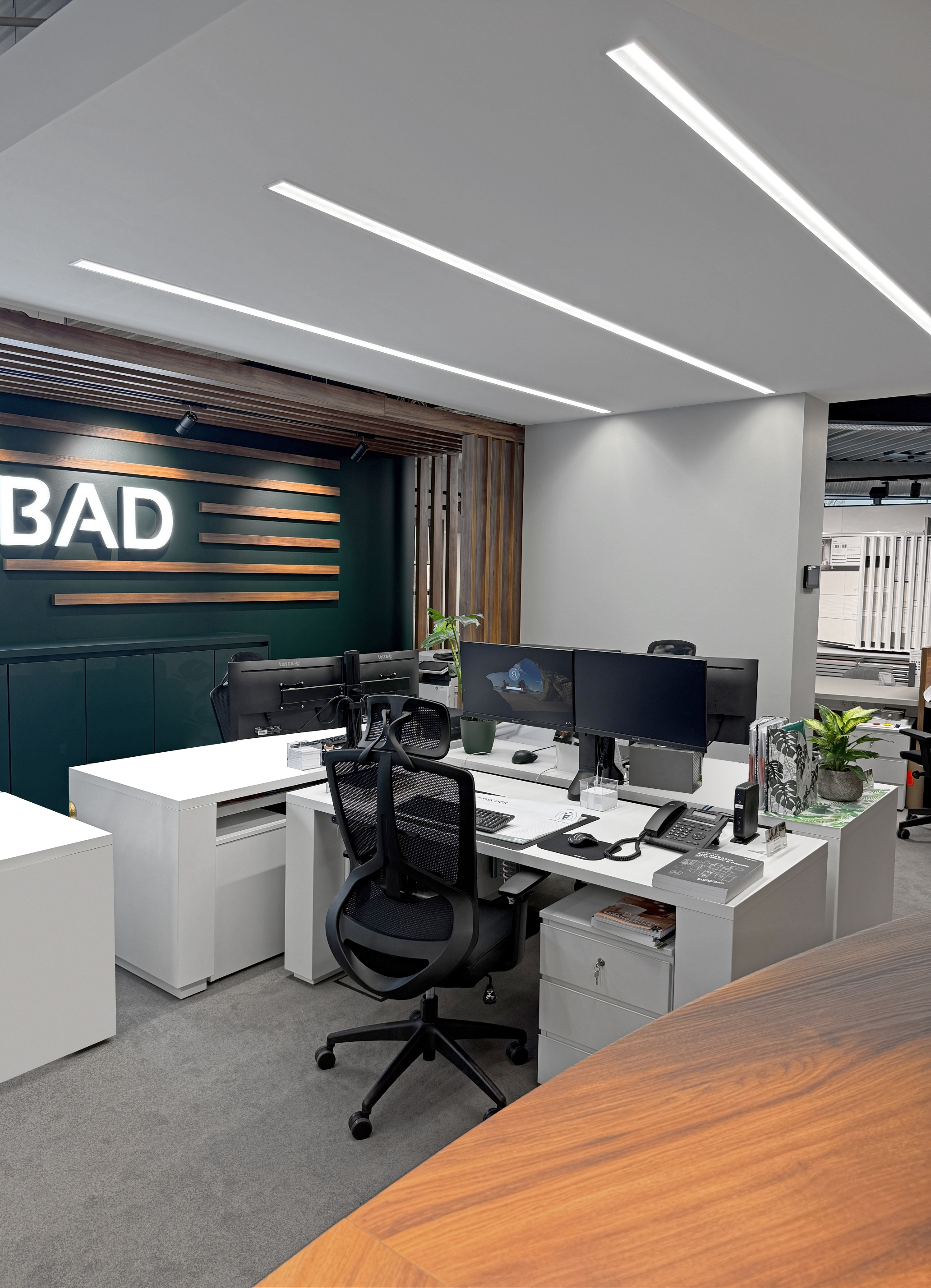 In Limburg realisierte die Eisen-Fischer GmbH & Co. KG auf 770 m² eine neue Ausstellung. LEBENS |T| RAUM Bad zeigt, wie wirkungsvoll Licht Räume inszenieren kann. Für Eisen Fischer durften wir eine Beleuchtung umsetzen, die Funktion und Atmosphäre in Einklang bringt. Zum Einsatz kamen die Strahler MDG und QGD an der Stromschiene, die die verschiedenen Badwelten gezielt und differenziert in Szene setzen. Im Arbeitsbereich sorgen Einbauprofile UE6E für eine angenehme, blendfreie und gleichzeitig arbeitsstättenrichtlinienkonforme Beleuchtung. Der komplette Bereich ist dabei individuell und flexibel regelbar. Ein besonderes Highlight im Mittelbereich ist die 2.500 mm große Ringleuchte RE-Type, die dem Raum eine starke, prägende Wirkung verleiht. Und auch das Erlebnis kommt nicht zu kurz: In einer Koje lässt sich die Lichtstimmung auf Knopfdruck von warmem Kerzenschein bis hin zu arktischem Sommer verändern. Die Steuerung erfolgt komfortabel über einen speziellen Taster oder per App auf Tablet und Smartphone. So bleibt der Gang zum Fenster erspart. Selbst an einem tristen Wintertag kann so auf Wunsch eine sonnige Lichtstimmung erzeugt werden.